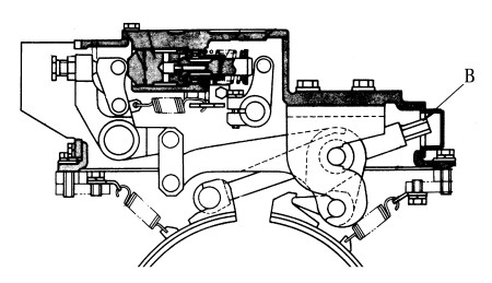 当刹车系统衬片摩擦后,会促使刹车系统踏板车旅程如一定程度增加了,在此应该对刹车系统鼓与刹车系统带间的间距来的调整。在行车刹车系统带与行车刹车系统鼓当中的标准宽度为0.3mm时,每台脚踏板的旅程为90-110mm(最大的旅程85-115mm)。(图1)1)拆卸后盖板板。(图2)2)用90Nm的扭距,压紧调低螺母(B)使行车汽车制动器带她的手抱紧行车汽车制动器鼓。3)汽车刹车带抱紧汽车刹车鼓后,再将螺母(B)拧松1-5/6圈,使汽车刹车鼓与汽车刹车带间的腐蚀痕迹0.3mm。某些地,汽车刹车跳板的过程为90-110mm。